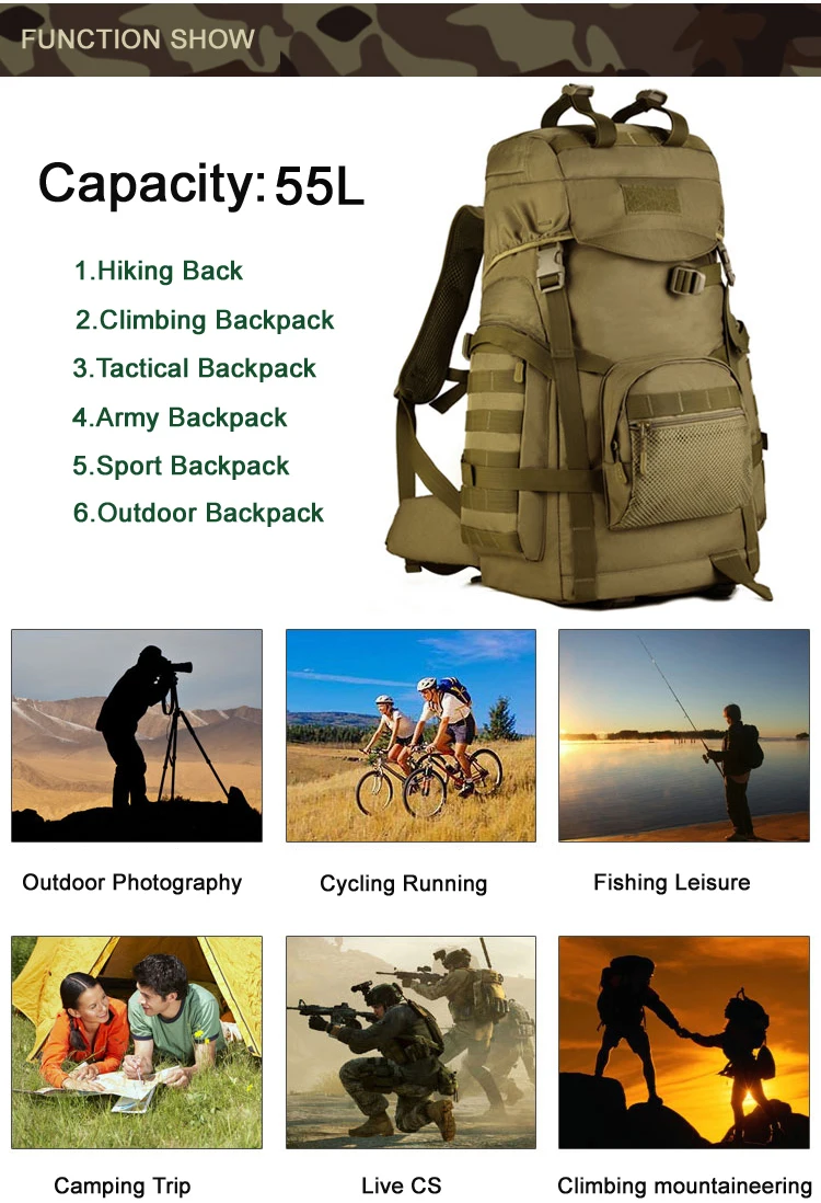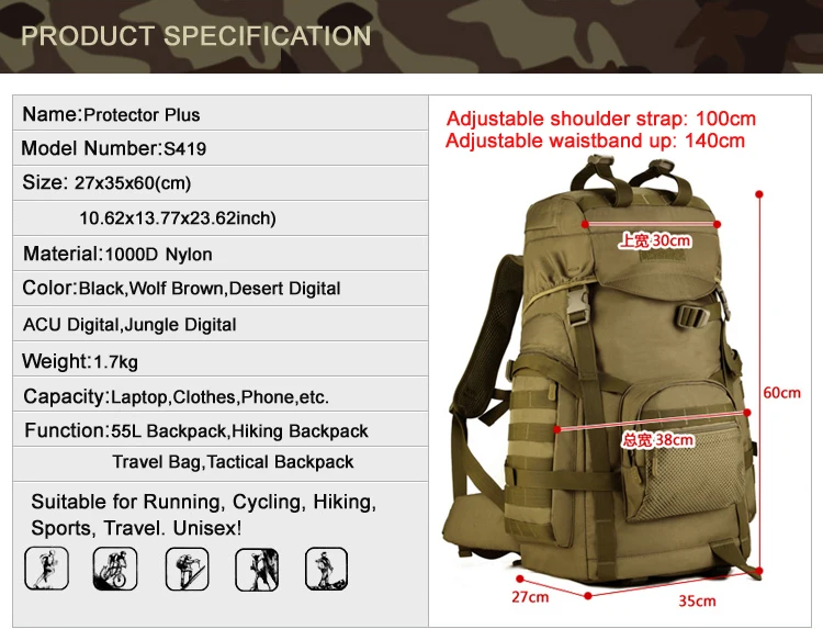 Бренд: Дорожная сумка Название: 60 л сумка для альпинизма Партномер: S419 Деменция: емкость около 60 л 60*38*30*35 Материал: нейлон Подкладка: водонепроницаемое покрытие + Мерсеризованный хлопок Вес: 1,7 кг Объем: Можно положить 15-дюймовый ноутбук, 20 мужских футболок и другие предметы Функция: большая сумка через плечо Подходит: фитнес, путешествия на открытом воздухе, Пешие прогулки