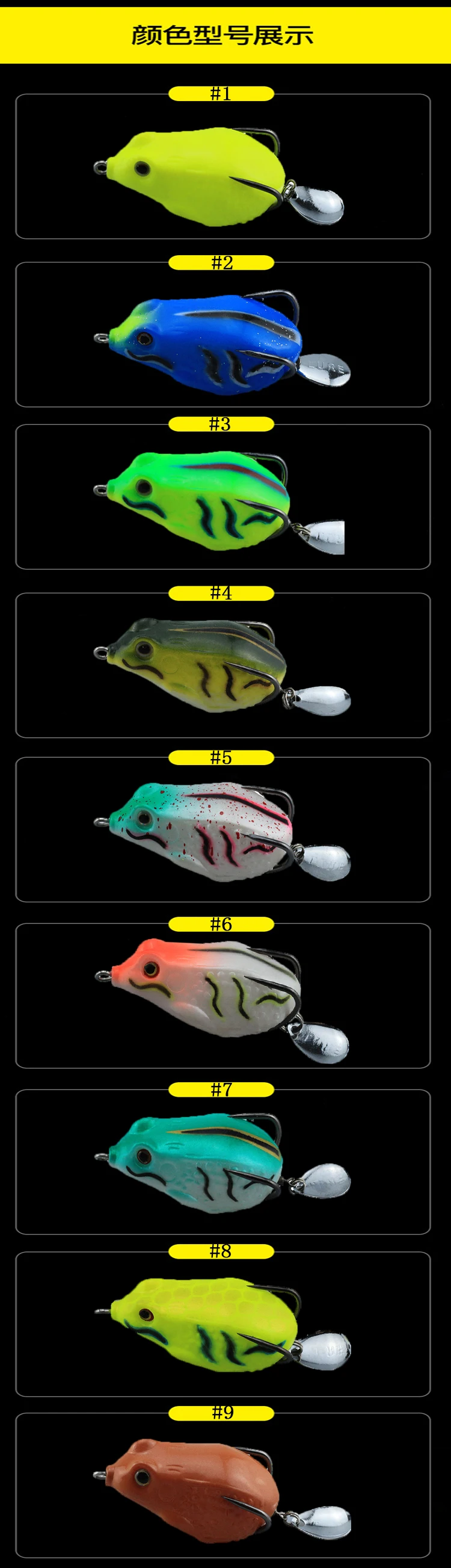 Название приманки: FG-M40 Вес приманки: 9,5 г/0.02LBS Длина приманки: 4 см/1,57 дюйма : Материал подошвы: полиуретан толщина Topwater Крючок: 2 * Прочный тройной крючок Глаза: рыбьи Глаза 3D Кольцо: усиленное двойное кольцо Цвет: 9 разных цветов s