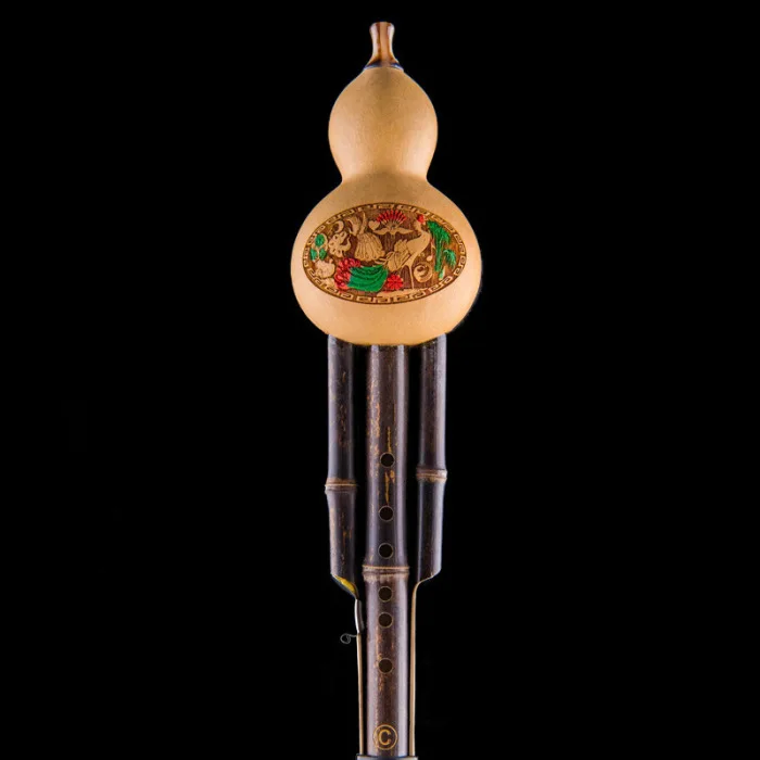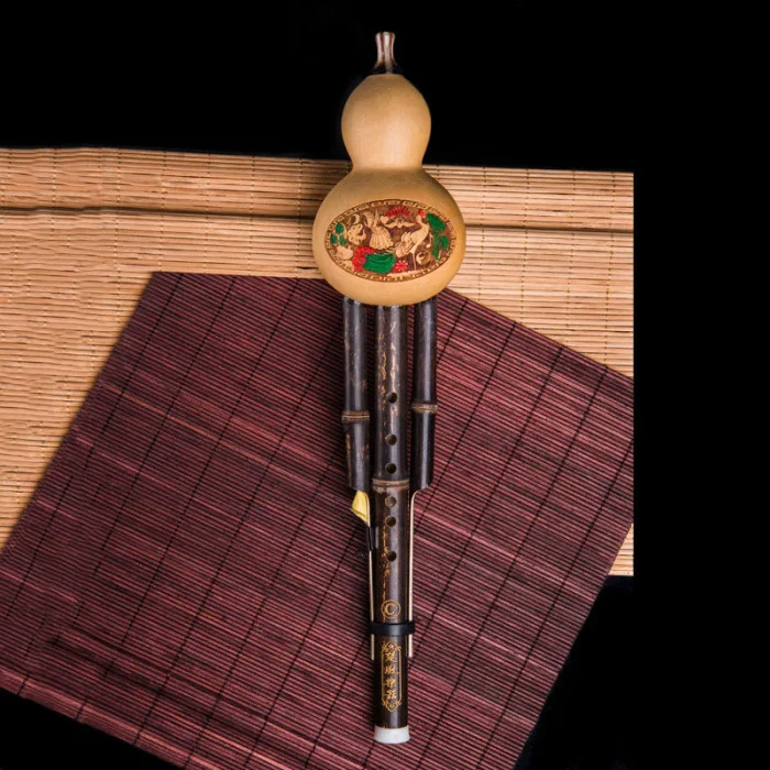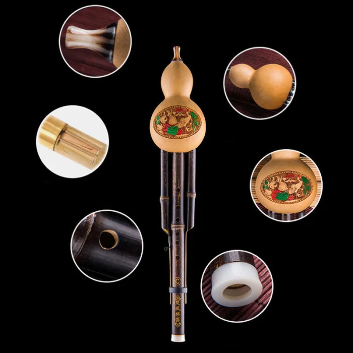 Элегантный внешний вид, ручной резной тыквы, черный бамбуковый тон трубы, с двумя подтрубами и одним плунжером.