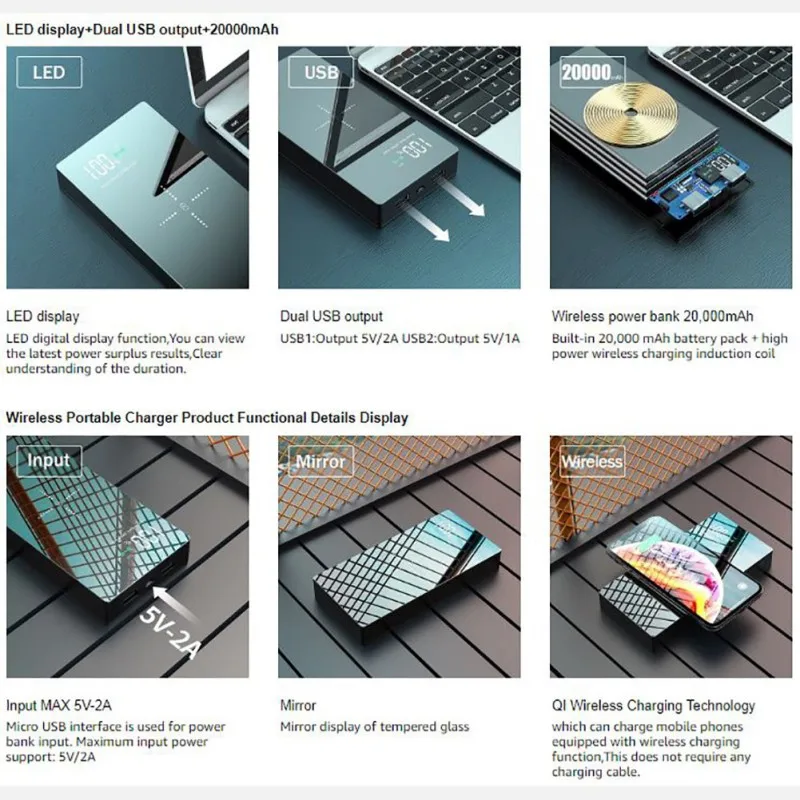 Feature 1.Portable Wireless Charging. Press the side button of power bank to turn on wireless charging, simply place down any Qi-enabled device or equipped with a Qi-compatible receiver device and charge, no cables or USB interface required, say goodbye to tangled wires and lost charging cable 2.The surface of the wireless portable charger adopts a new tempered glass surface and adopts a new generation of LED liquid crystal power display screens to display the remaining power at a glance. Intelligent management to better plan travel 3.Wireless battery charger provides 10000mAh/20000mAh of power for Android, for iPhone, or other USB port devices. Support up to 3 devices for charging: 2 x Wired charging + 1 x Wireless charging. Dual USB Output: 5V/2A, 5V/1A 4.Wireless charger power bank supports over-charged, over-discharged, over-voltage, over-current and short circuit protection. Stop charging when the device is full charged, prevent over-charging, overheat, short circuit and extend the service life of your phone, perfectly protects your digital devices from charging accident 5.LED Liquid Crystal Power Display Screen with Tempered Glass Case, durable and stable power bank, beautiful and elegant appearance Specifications Product Name:LED Display Wireless Power Bank 10000mAh/20000mAh Color:Black, White Battery Type:Lithium Polymer Battery Capacity:10000mAh/20000mAh Output:5V/2.1A Case Material:Tempered Glass Screen:LED Liquid Crystal Power Display Screen Wireless Charging Distance:8mm Note The real color of the item may be slightly different from the pictures shown on website caused by many factors such as brightness of your monitor and light brightness. A Package Included 1 x LED Display Wireless Power Bank 20000mAh B Package Included 1 x LED Display Wireless Power Bank 10000mAh