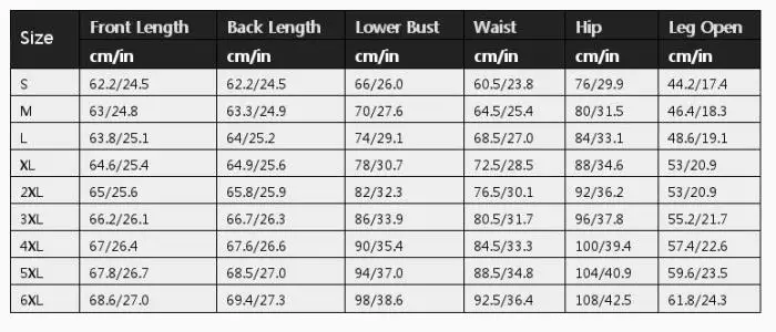Размер::3XL | Длина спереди (см/дюйм)::66,2/26,1 | Длина спины (см/дюйм)::66,7/26,3 | Нижний Бюст (см/дюйм)::86/33.9 | Талия (см/дюйм)::80,5/31,7 | Бедра (см/дюйм)::96/37.8 | Длина ноги (см/дюйм)::55,2/21,7 |