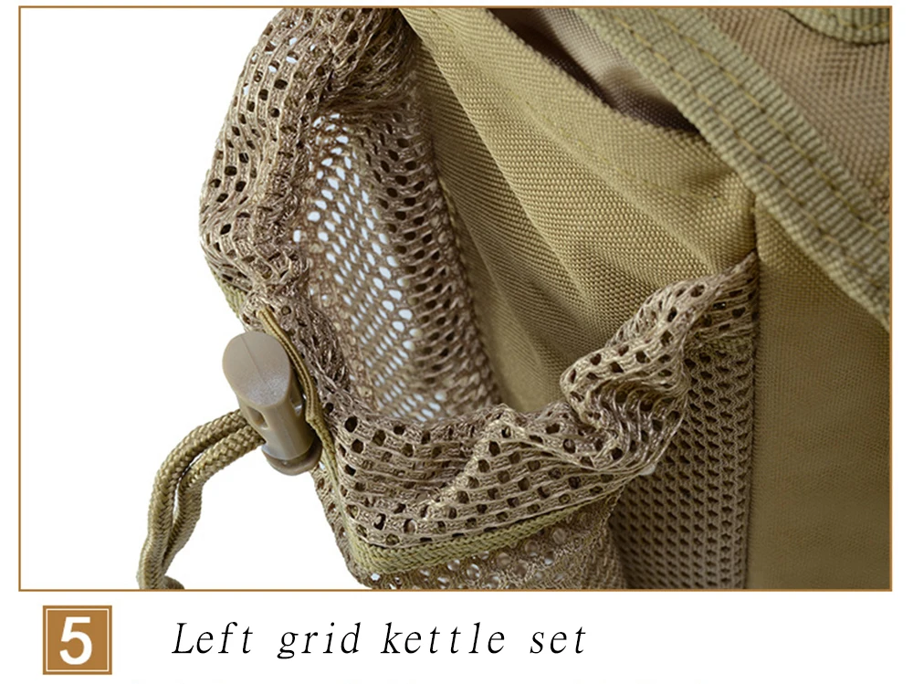 Боковые карманы: карман на молнии и Молле и сетчатый карман с застежкой на шнурке.
