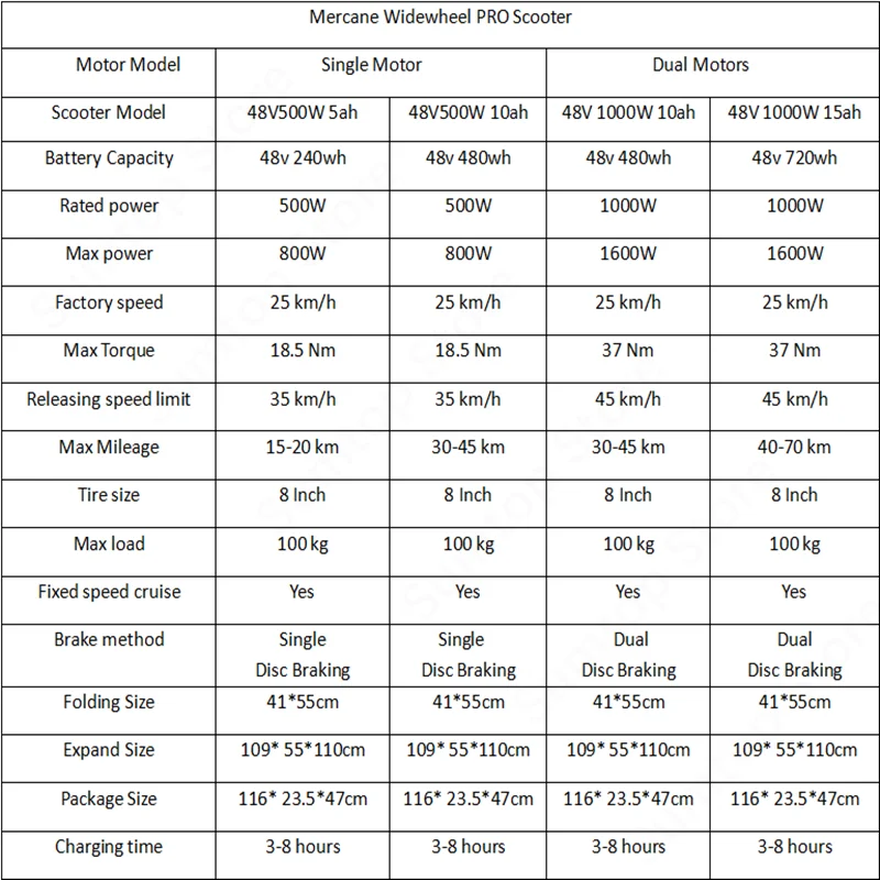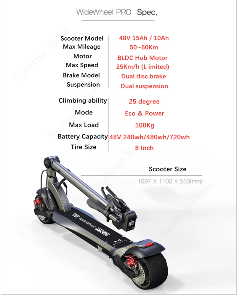 Батарея: 48V 15Ah Дальность действия: 70 км Двигатель: 48V 500W (спереди и сзади) Скорость: 40 км/ч (без ограничений) Подвеска: двойная подвеска Способность восхождения: <40% Режим: Eco & Power