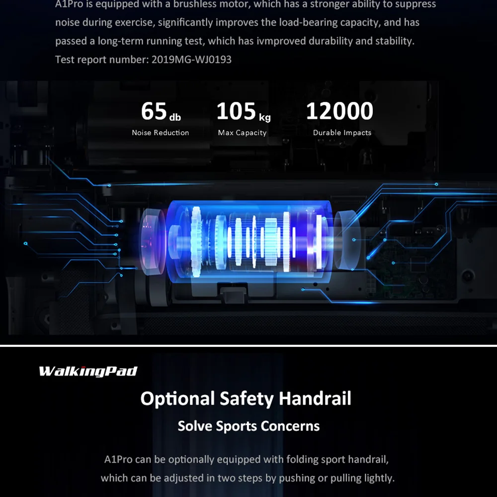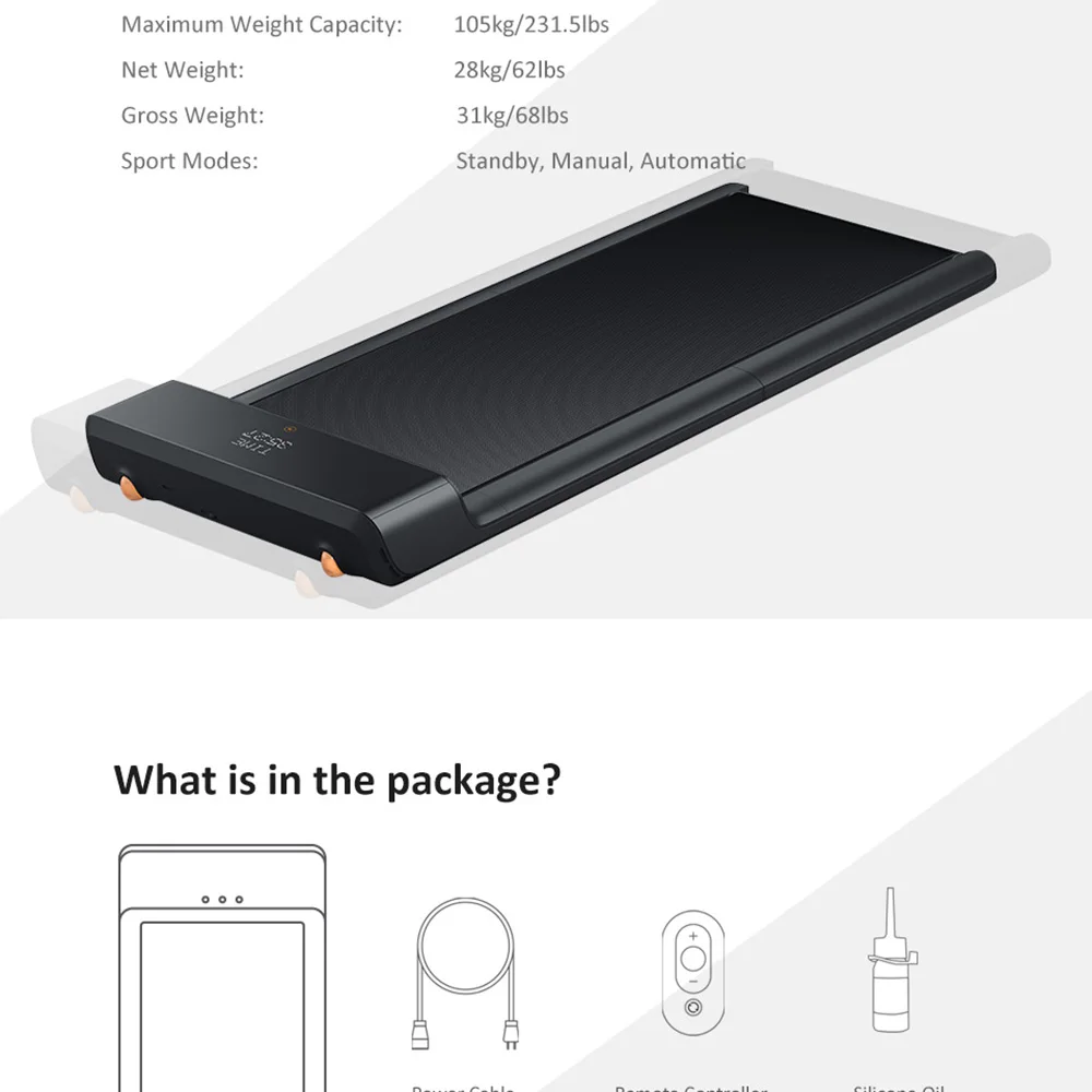 Working size: 1432x547x129mm Folded size: 822x547x129 Walking surface: 1200x415mm Applicable age: 14-16 years old Speed range: 0.5-6km/h Rated voltage: 110v / 220v Rated power: 746w Platform height: 57mm Maximum load: 105kg Net weight: 28kg Total weight: 31kg Sport mode: automatic, manual 1 x walking mat 1 x power cord 1 remote control 1 x remote control lanyard 1 x wrench 1 x silicone oil 1 x manual *Precautions: After receiving the product, you can apply for a refund without affecting the secondary sales.