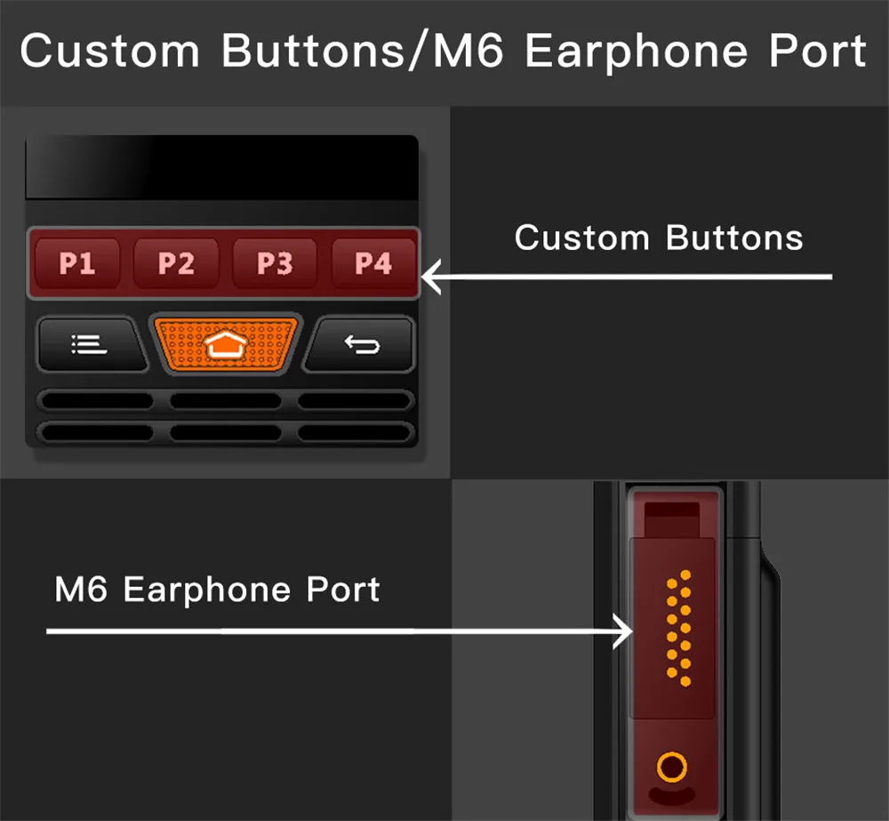 Кнопки PTT, кнопка увеличения и уменьшения громкости, клавиша камеры, кнопка SOS, питание, домой, меню, назад, 4 резервных ключа