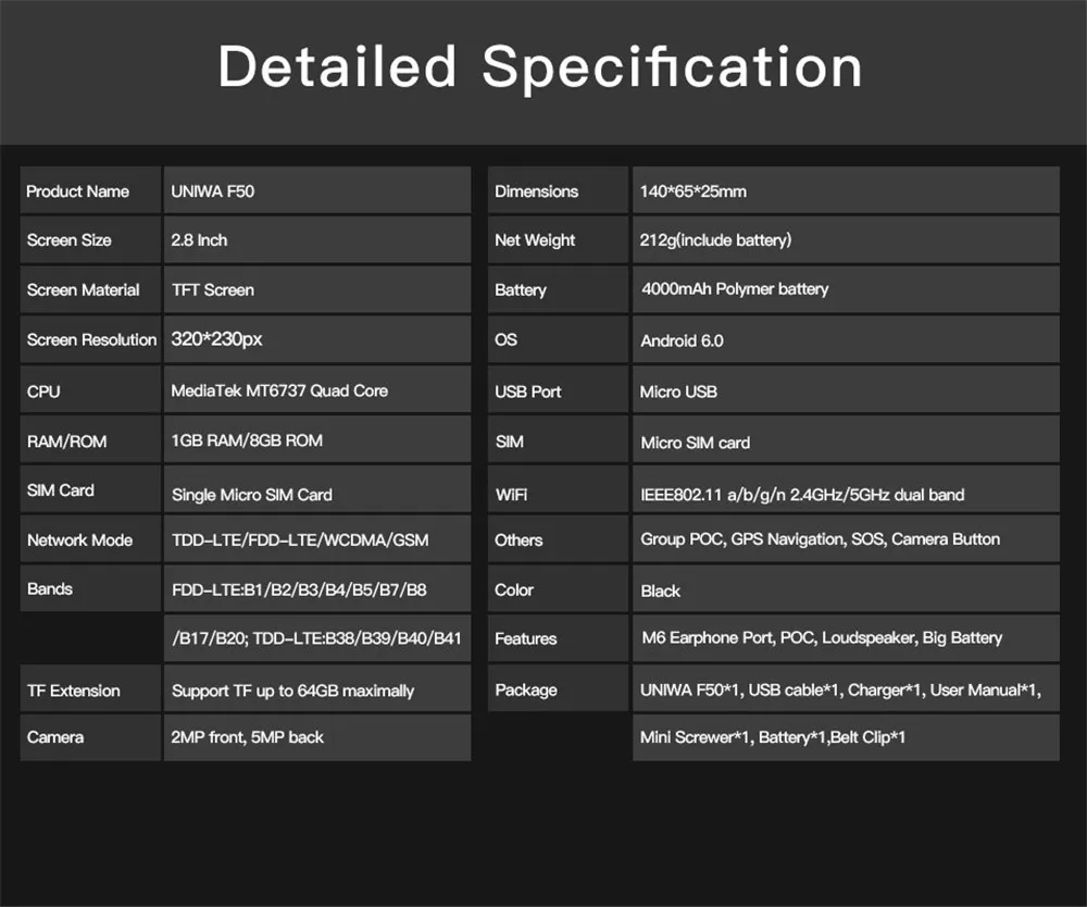 4G: FDD-LTE:B1/B2/B3/B4/B5/B7/B8/B17/B20; TDD-LTE:B38/B39/B40/B41