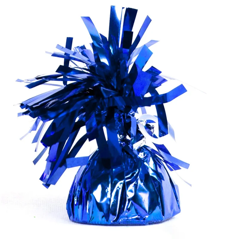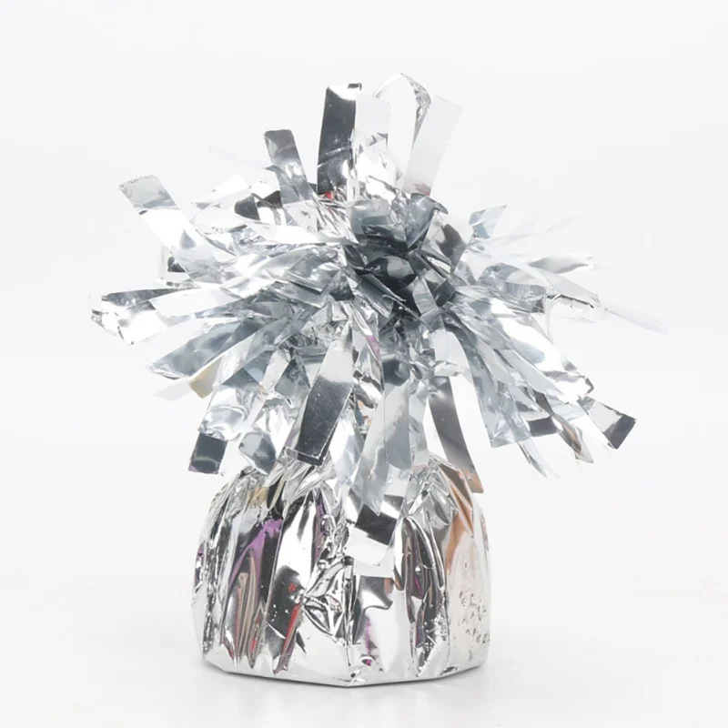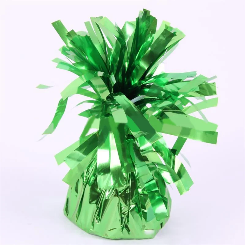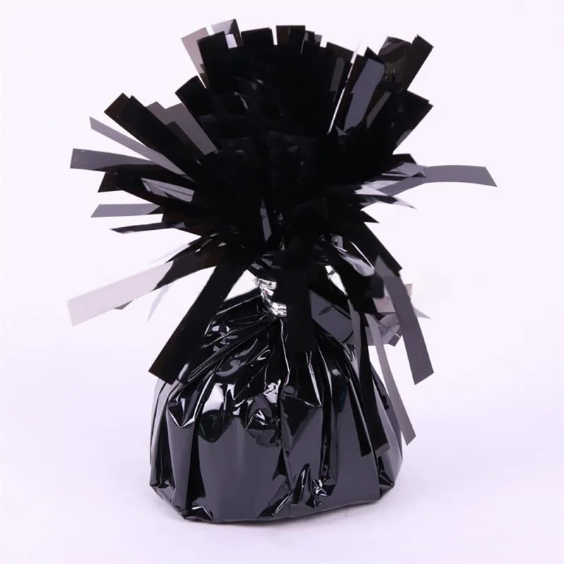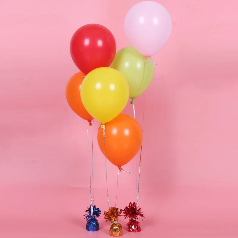 4. Excellent hanging balloon bouquet and single balloon. Each weight is wrapped in a colored decorative foil, and the top of each weight is decorated with wire-like colored stripes.