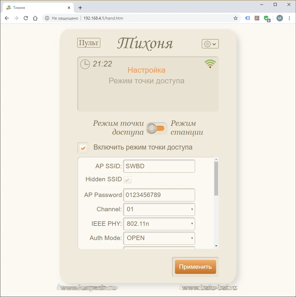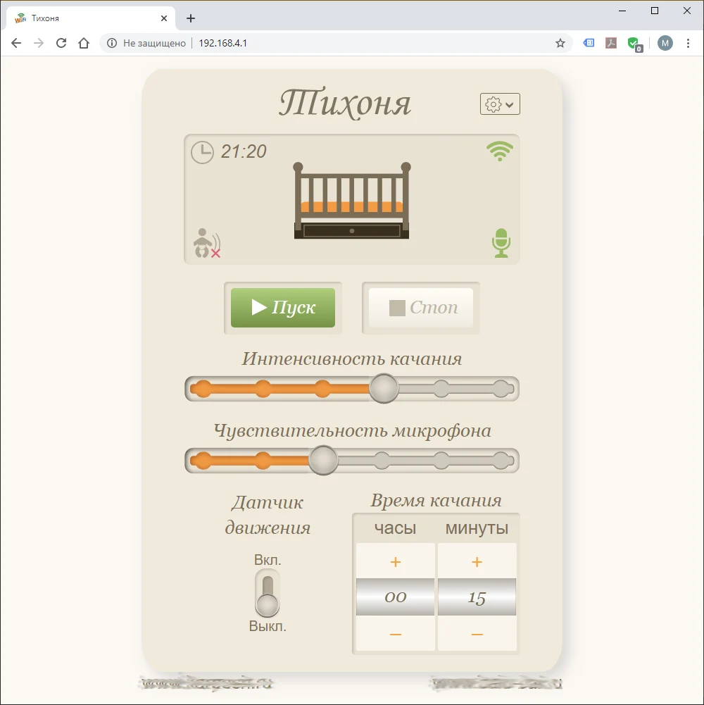 Device with 6 "speeds" swing, timer, reaction to crying and movement of the baby. Control over Wi-Fi with the help of a phone, tablet, computer. Stop with interface or hand. Web server inside the device.