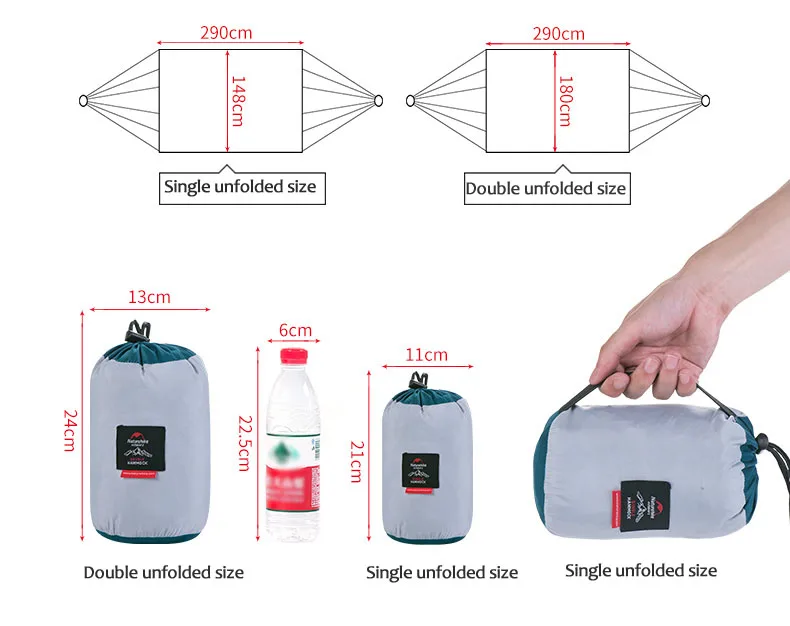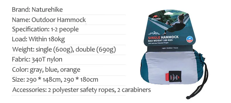 Торговая марка: Naturehike Название: открытый гамак Параметры: 1-2 человек Нагрузка: в пределах 180 кг Вес: один (600 г), двуспальная кровать (690 г) Ткань: 340 т анти разрыв ткань из полиэстера Цвет: серый, синий, оранжевый Размеры: 290*148 см, 290*180 см Аксессуары: 2 полиэстер безопасности веревки, 2 карабина