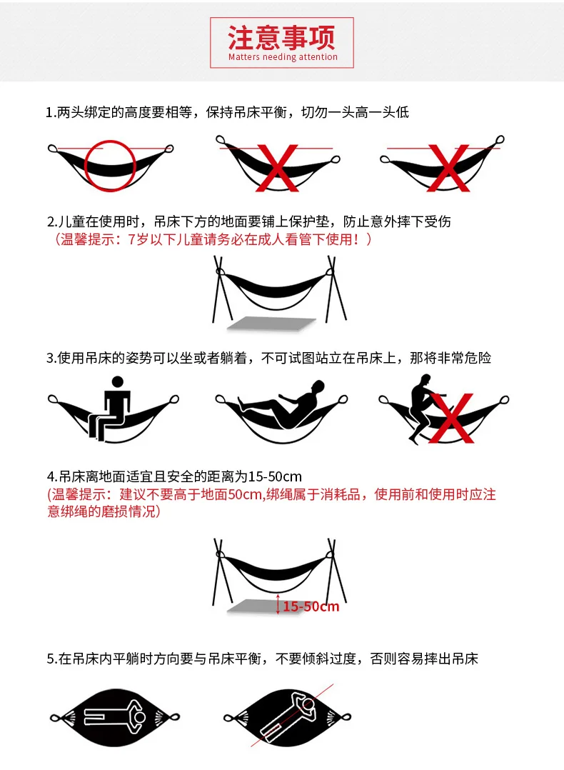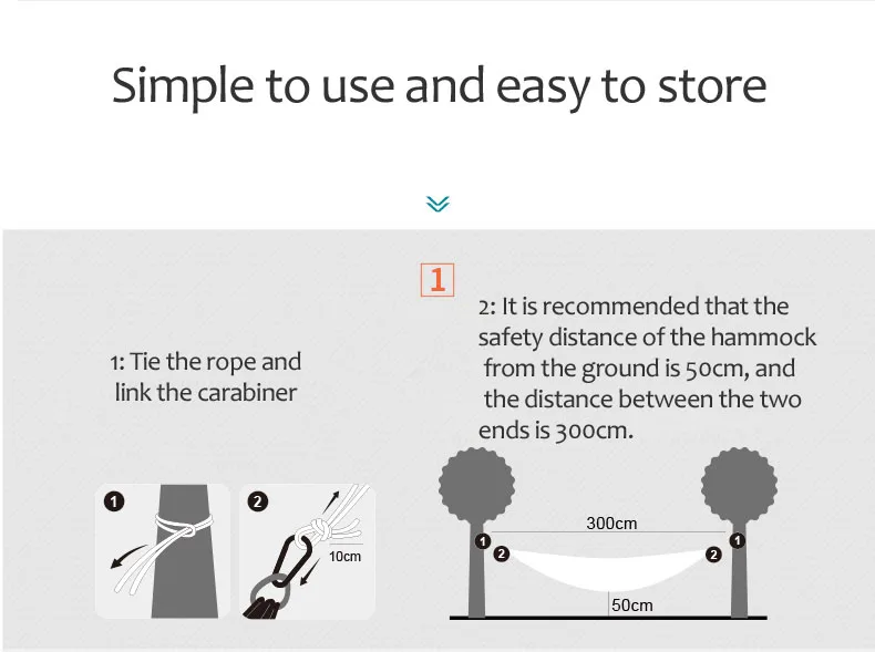 1: Завяжите веревку и ссылка на карабин 2: Рекомендуется заказывать на безопасное расстояние гамака от земли-50 см, и для этого способа работы расстояние между двумя концами 300 см.