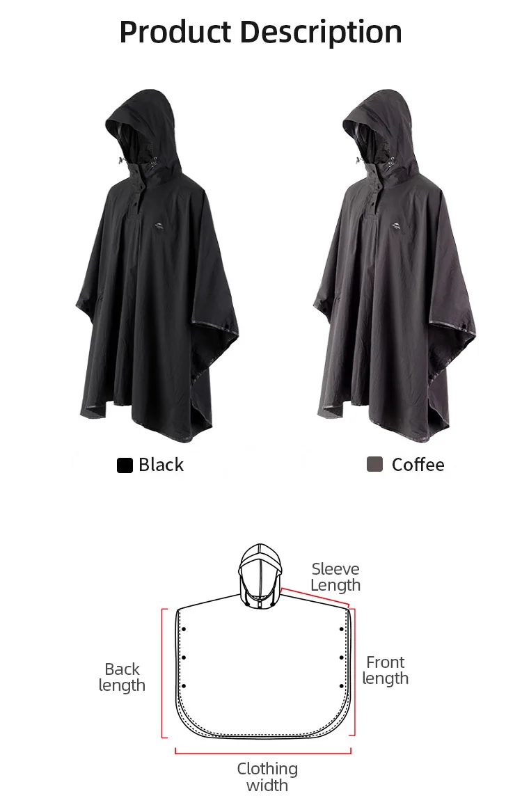 Описание товара: Название продукта: дождевик Naturehike Номер модели : NH20FS006-1 Материал: 100% полиэстер Размер: M/L/XL Вес: 380 г (Размер M)/420 г (размер L)/460 г (размер XL) Сезон: четыре сезона Преимущество: защита от ветра/дождя Использование: для ходьбы/скалолазания Цвет: черный/кофейный Описание товара: Бренд: Naturehike пончо Номер модели : NH20FS005 Материал: 100% полиэстер Размер: M/L Вес: 390 г (Размер M)/430 г (размер L) Сезон: четыре сезона Преимущество: защита от ветра/дождя Использование: на ногах/скалолазании/кемпинге Цвет: черный/кофейный