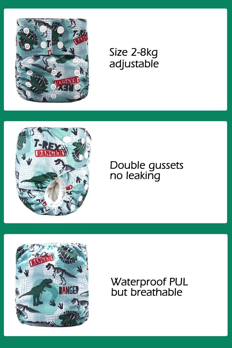 Сколько подгузников вам нужно? · От новорожденных до 4 месяцев -- 20 ~ 30 подгузников · Младенцы (от 4 до 10 месяцев) -- 20 ~ 25 подгузников · Для малышей (более 10 месяцев) -- 15-20 подгузников · Зависит от того, как часто вы стираете одежду. Как стирать? · Стирать перед первым использованием. · Удалите и снимите краску с остатков (выбрасывайте твердые вещества в унитаз) перед хранением в сухом пакете. · Подгузники можно стирать в стиральной машине и сушить, температура воды при 30 °C. · Повесьте их до высыхания на солнце (Солнечный свет помогает отбеливать подгузники, чтобы удалить любые оставшиеся пятна), или Высушите в сушилке на среднем каблуке до полного высыхания подгузников, затем выверните их наизнанку через 45-60 минут. · Не храните подгузники слишком много дней, следует мыть в течение 1-2 дней; · Не отбеливать, не смягчить
