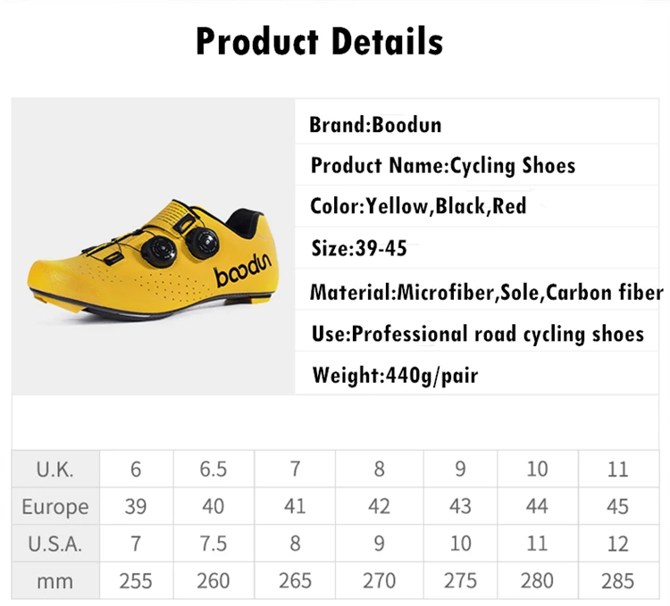 Особенность 2:Водонепроницаемый, амортизаторПреимущества:1. Дизайн nticollision2. Дизайн с конусным каблуком со светоотражающей полосой, внутренняя Нескользящая лайкра3. Система отведения тепла 3D сетка отверстие дизайн, более мягкий и дышащий4. Воздухопроницаемая стелька EVA, ударопрочный, впитывающий потПосылка включает:1 пара велосипедных ботинокПримечание:Пожалуйста, выберите подходящий размер в соответствии с вашими измерениями. Европейский размер указан только для справки. Спасибо за понимание.1. Пожалуйста, учитывайте погрешность в 5 мм, так как измерения выполнены вручную. Если ваша стопа сильнее, чем обычно, пожалуйста, выберите больший размер2. Цвет дисплея будет немного отличаться, потому что другой монитор и светильник, спасибо за понимание!Примечание: наша обувь европейского размера, пожалуйста, внимательно проверьте размер перед размещением заказа, спасибо.