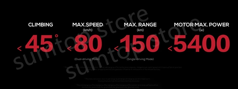 Скалолазание: не более 45 градусов Максимальная скорость: 80 км/ч Максимальный диапазон: 150 км (режим ECO) 90 км (режим Dual-drive) Максимальная мощность двигателя: 5400 Вт
