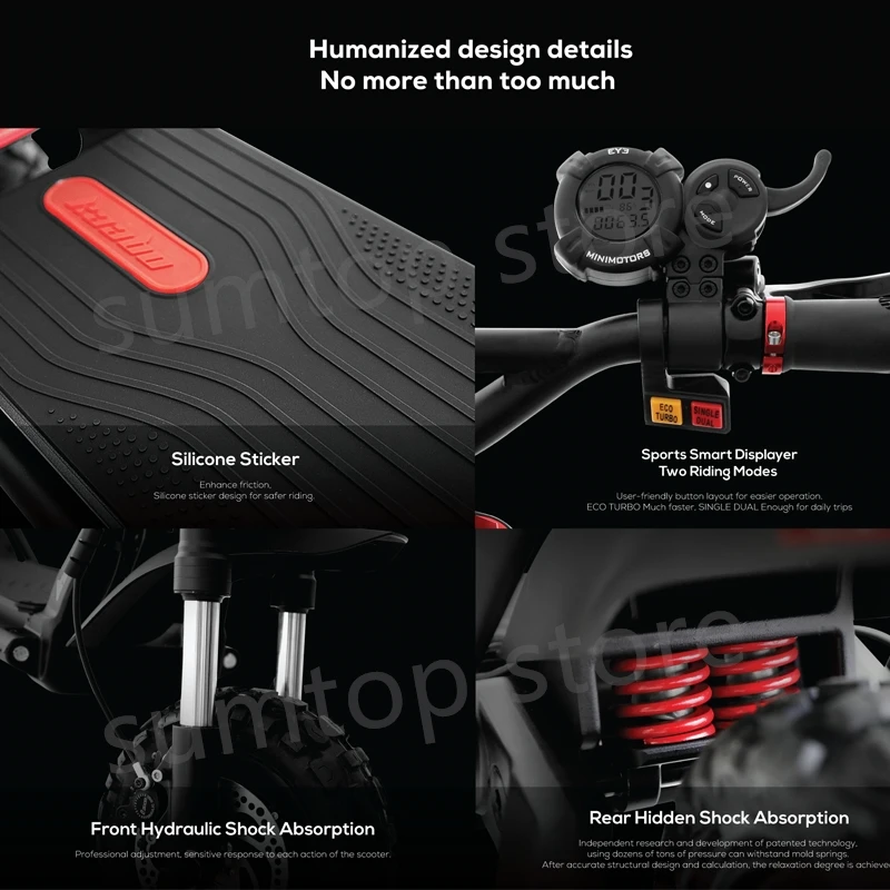 Силиконовые наклейки, повышают трение, силиконовые наклейки для более безопасной езды Спортивный Smart Displayer, два режима езды, Удобное расположение кнопок для облегчения работы ECO TURBO гораздо быстрее, один двойной достаточно для ежедневных поездок Передняя гидравлическая амортизация, профессиональная регулировка, чувствительная реакция на каждое действие скутера. Задняя Скрытая амортизация, независимые исследования и разработка запатентованной технологии, Использование десятков тонн давления может выдерживать плесень пружины. После точной конструкции и расчета, степень релаксации достигается.