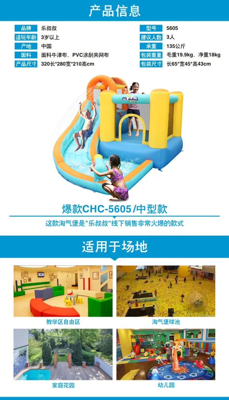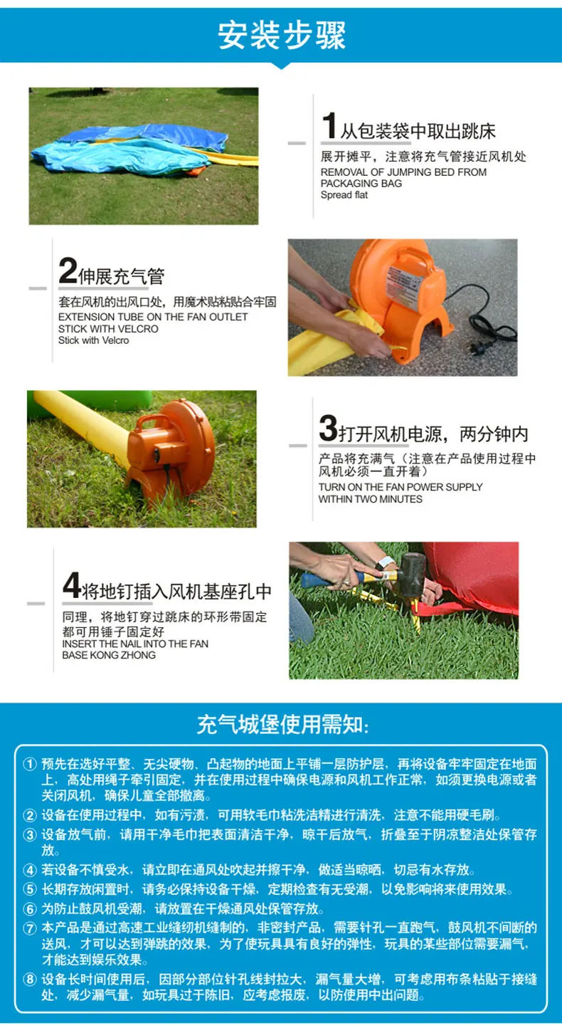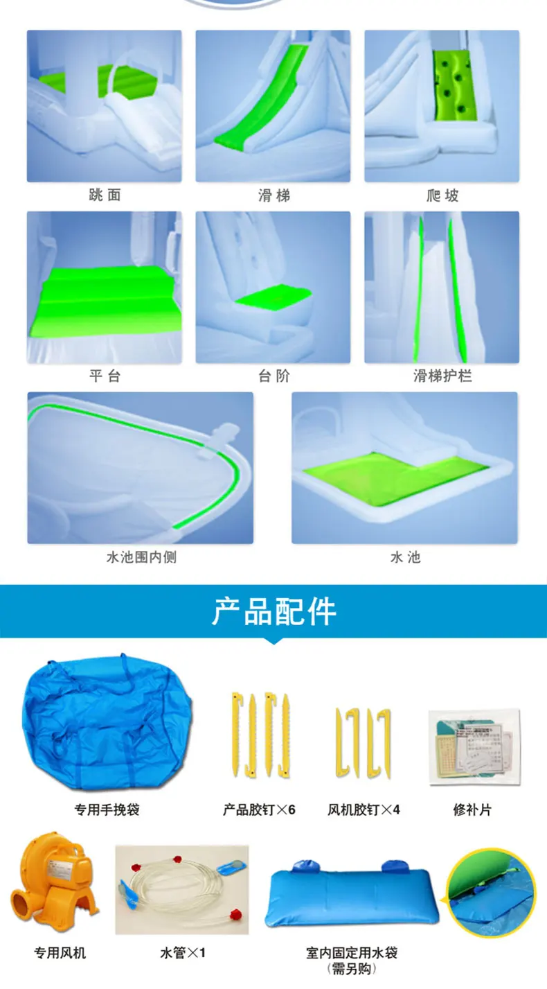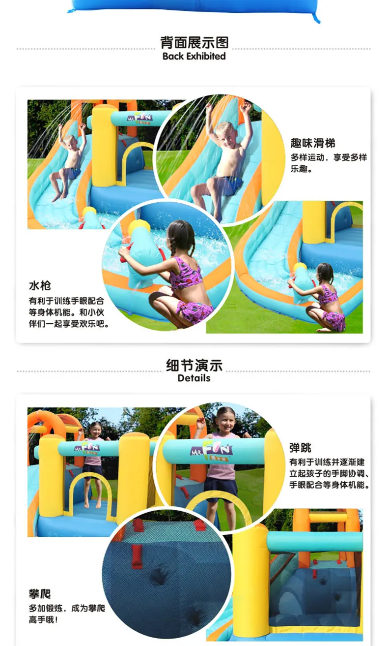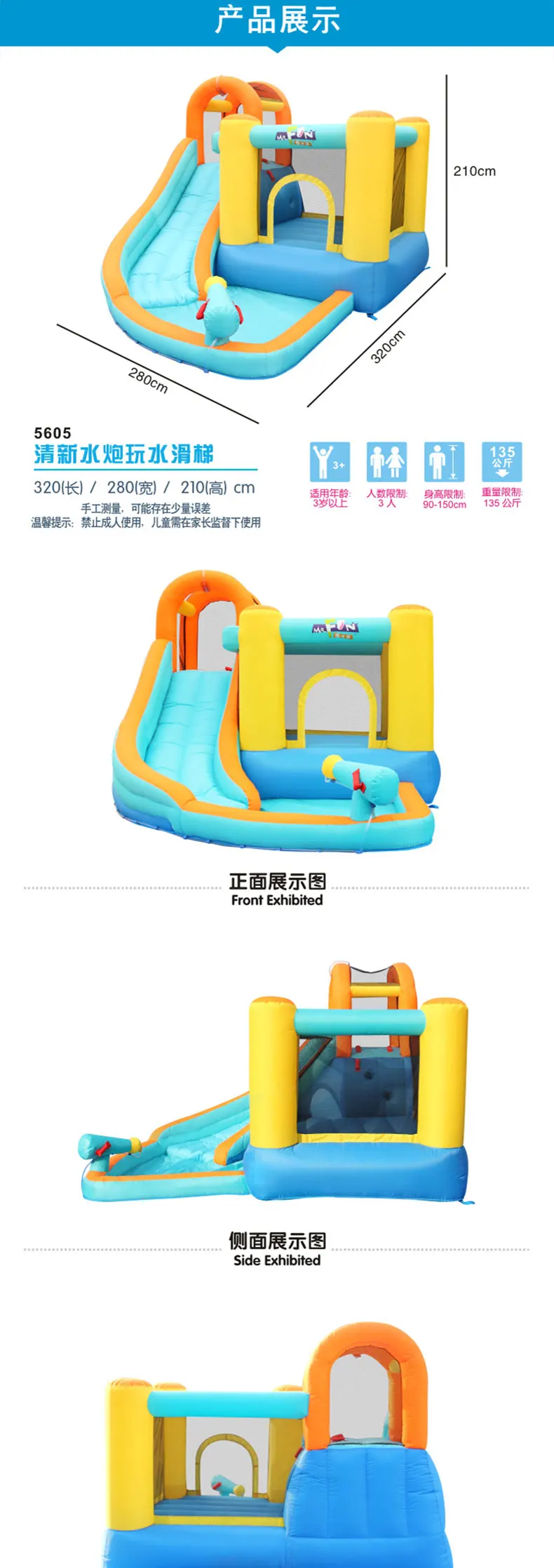 1. Размеры: 320*280*210 см 2. Максимальная нагрузка: 135 кг 3. Функция: альпинист, прыгающая кровать, горка, водяной пистолет, водный бассейн 4. С ремонтным комплектом и воздуходувкой