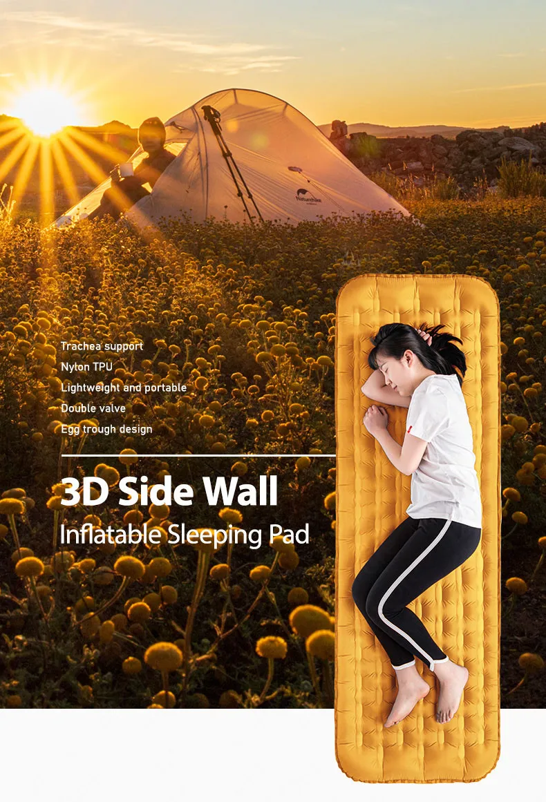 Бренд: Naturehike Наименование: 3D надувной коврик для сна на боковой стенке Материал: нейлон 20D/ТПУ Вес: 980 г Размер: 195*65*9 см Размер упаковки: #12*32 см Цвет: синий/желтый Аксессуары: сумка для хранения/надувная подушка/лента для обвязки/Сумка для ремонта Использование: Кемпинг/Туризм/путешествия