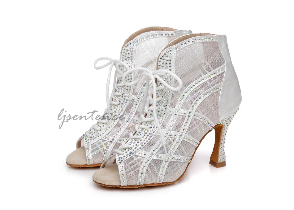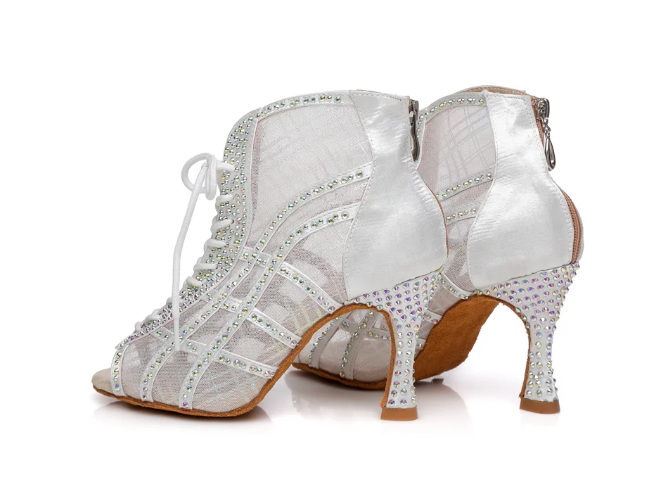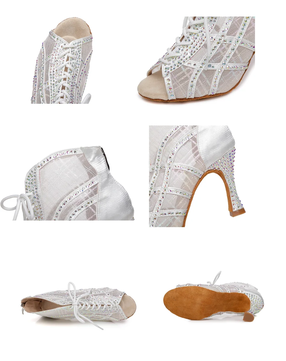 Женская обувь для латинских танцев; Обувь из кожи и сатина; Блестящая обувь с большими и маленькими кристаллами; Каблук 9 см; Обувь для танцев на узкой подошве; Цвет белый