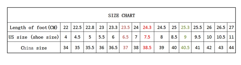 Пожалуйста, обратите внимание на таблицу размеров. 1. Пожалуйста, сначала измерьте свою стопу, а затем выберите Размер соответственно, не выбирайте размер непосредственно на основе вашего обычного уличного размера обуви; 2. Длина единицы измерения составляет см (Сантиметр), f.y.i. 1 см = 0,393 дюйма, 1 дюйм = 2,54 см; 3. Вся обувь измеряется вручную, это может быть разница в 1-2 мм с точным размером правил, спасибо за понимание.