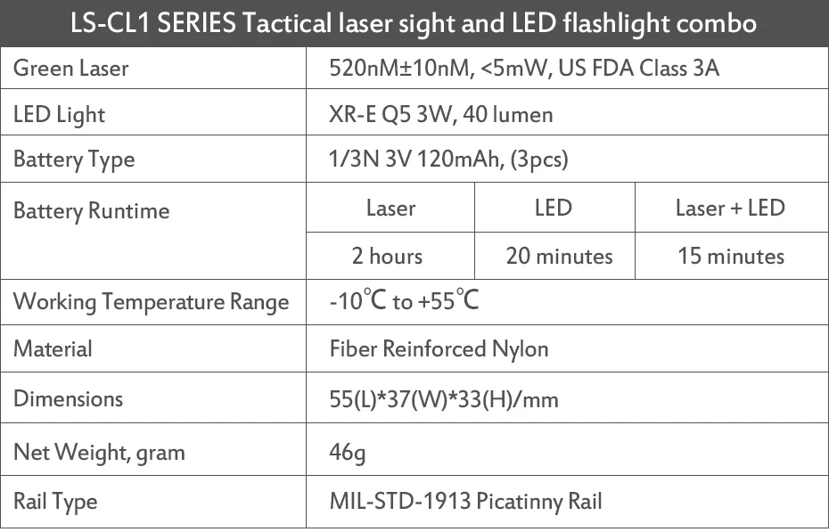 1. Лазерный прицел и белый светильник 18 люменов. 2. Подходит для всех рельсовых пистолетов, длинных пистолетов и подложек. 3. Ambidextrous ВКЛ/ВЫКЛ переключатели с обеих сторон. 4. Отличная производительность в условиях низкой температуры. 5. 100% соответствует стандарту производительности FDA для лазерных продуктов. 6. Регулировка ветра и высоты. 7. Ударная, ударная и пулеметная конструкция с защитой от ударов. 8. Защита от пыли и воды. 9. Изготовлен из FRN, легкий. 10. Простота установки и эксплуатации. 11. 18 месяцев гарантийного срока.