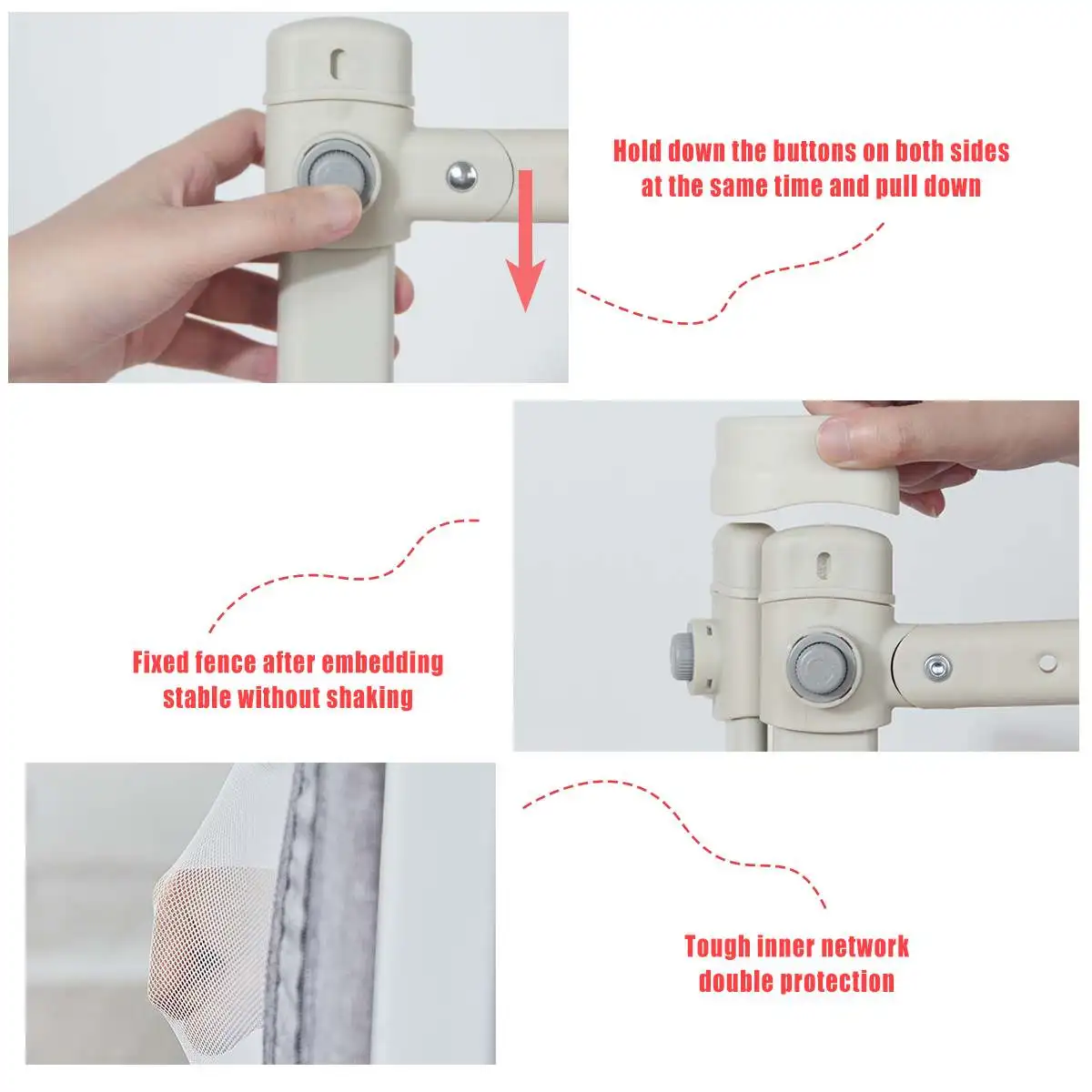 -Безопасно и удобно-рейлинги покрыты прочной сетчатой нейлоновой тканью, ткань без формальдегида, высокая плотность, износостойкие, удобные на ощупь, нелегко порвать, легко заменяется и моется. Конструкция каркаса из высококачественной стали, высокая устойчивость и долговечность, может защитить вашего ребенка.