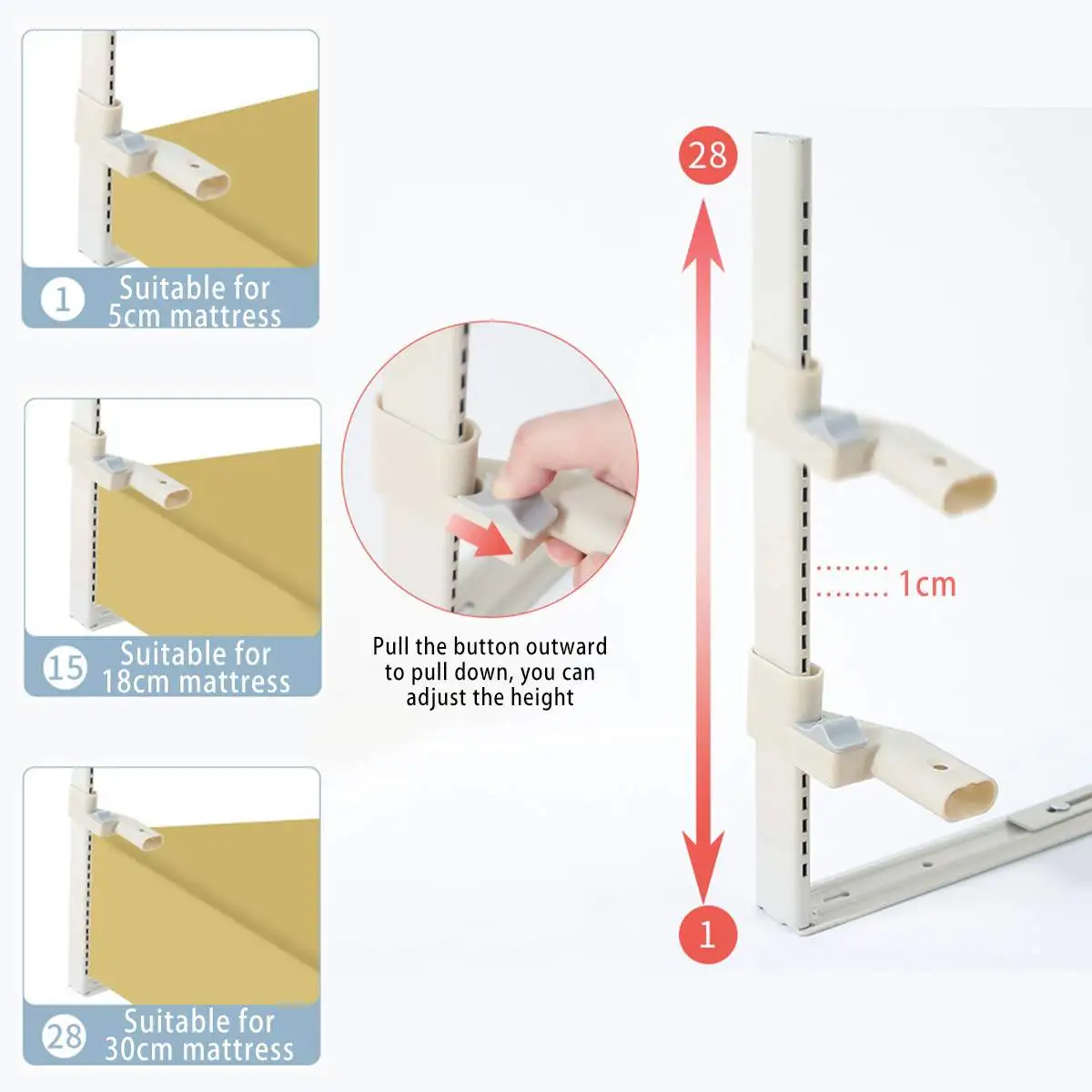 -Простота установки-подробная инструкция, никаких инструментов, простота установки, никаких проблем. Простота в эксплуатации, потяните поручень кровати малыша вверх, и вы можете легко прикрепить поручень кровати для детей к якорю. Нажмите кнопку, чтобы спрятать рейку кровати для малышей между матрасами. Складная конструкция экономит ваше домашнее пространство.
