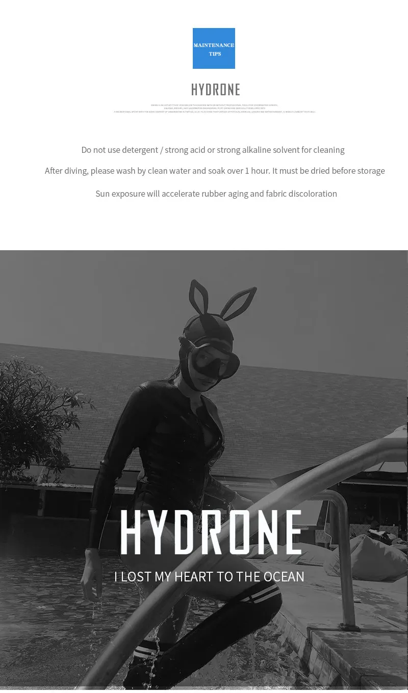 -Не используйте моющее средство/сильную кислоту или сильный щелочной растворитель для очистки, пожалуйста, мыть при нормальной температуре воды и замочить в течение 1 часа после погружения, сильное солнце взрывается ускорит старение неопрена и обесцвечивание ткани.