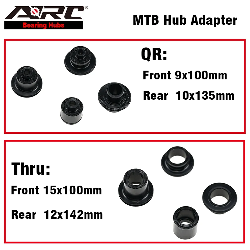 [Material]: Aluminum Alloy [Weight]: Front 15+(-)5g / Rear 23+(-)5g [Size]: QR Front 9x100mm / Rear 10x135mm Thru Front 15x100mm / Rear 12x142mm [Quality]: 1 Pair [Color]: Black [Application]: ARC hub ((MT005 / MT007 / MT010CB / MT010CB PRO 11S)