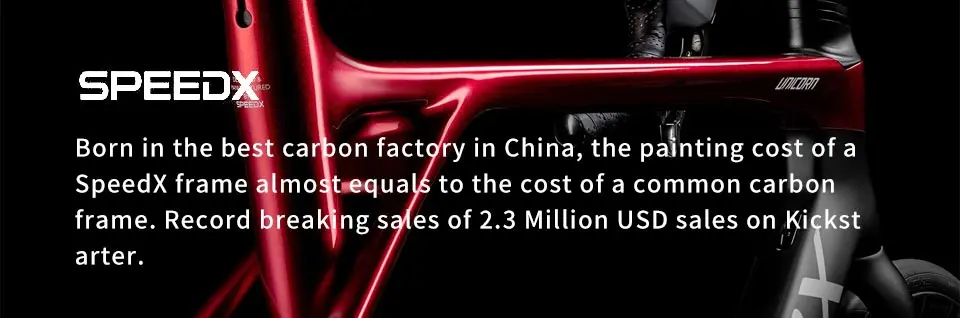 Родившаяся на лучшем заводе по производству карбонов в Китае, стоимость покраски рамы SpeedX почти соответствует стоимости общей карбоновой рамы. Рекорды по выгодной цене с доставкой, 2,3 миллионов долларов США на Kickstarter.