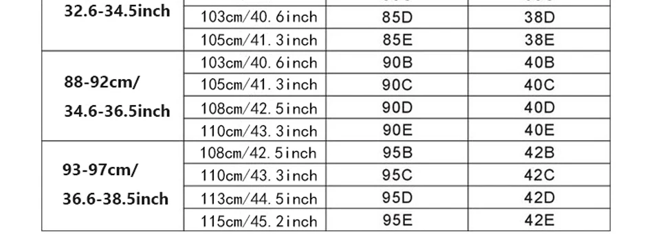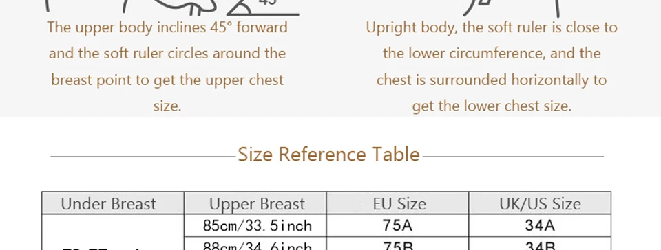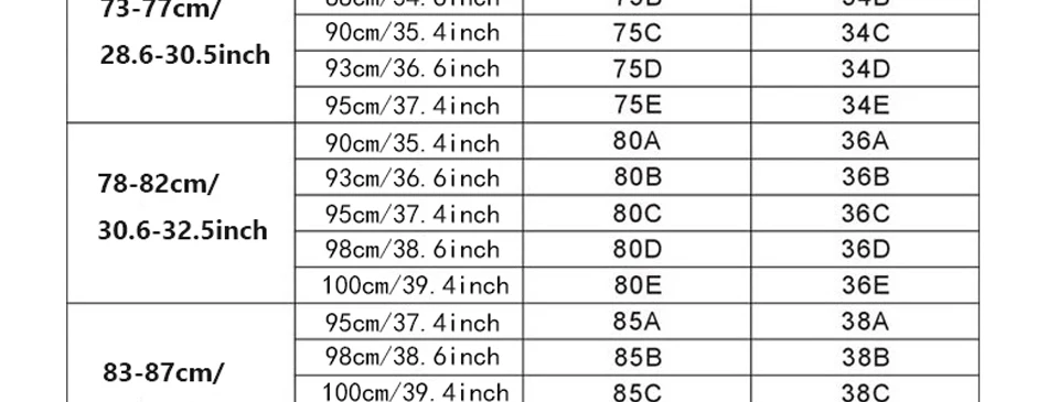 2. Выберите размер A. Тип чашки = бюст-грудь Разное значение: 7-10 см/2,75-дюйма Тип чашки: A Разное значение: 10-12,5 см/3,93-дюйма Тип чашки: B Разное значение: 12,5-15/4, 92-дюйма Тип чашки: C Разное значение: 15-17,5 см/5,90-дюйма Тип чашки: D B. Размер бюстгальтера = Грудь + Тип чашки Например: Ваш размер груди 96,5 см Размер груди 83,5 см Разница в 13,0 см Соответствует чашке C Тогда ваш размер бюстгальтера 85 C