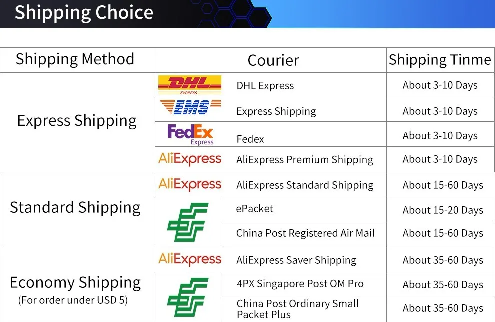 Поскольку CONVID-19, EMS будет намного медленнее, чем обычно, и могут возникнуть некоторые проблемы с таможенным оформлением. Пожалуйста, используйте премиум-доставку AliExpress для доставки. Спасибо!