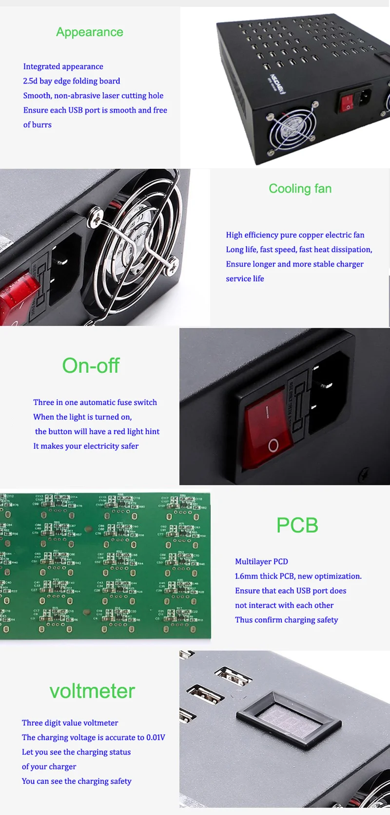 Описание товара: 20 портов USB зарядное устройство светодиодный дисплей мульти док-станция для зарядки с USB универсальный мобильный телефон настольное настенное домашнее зарядное устройство s UK Plug. Оснащен индивидуальным светодиодный индикатором, чтобы уведомить о ходе зарядки. Он выключен при выключении питания, он будет красным, когда он будет заряжен, он синий, когда емкость зарядки достигает более 95%, и он будет выключен при полной зарядке. Предназначен для легкого использования: Благодаря гладкому и компактному дизайну вы можете легко разместить концентратор USB 3,0 на вашем столе или рабочем месте, чтобы сделать ваши usb-устройства более доступными. Между портами USB 3,0 также достаточно места, поэтому легко подключать и отключать устройства, которые вы используете больше всего. Концентратор USB 3,0 поддерживается практически во всех операционных системах, что обеспечивает легкую установку без необходимости установки драйвера. Широкая совместимость: Совместим с iPhone, iPad, Samsung Galaxy, сотовыми телефонами, планшетами, камерами, eReaders, bluetooth-гарнитурами динамиков, блоком питания, MP3 /MP4 плеером, дронами и многими другими. Идеальная многопортовая зарядная станция USB для нескольких устройств с питанием от usb. Мульти Безопасность и защита: Встроенная защита от перегрева, перезаряда, перегрузки по току, перегрузки, перенапряжения, короткого замыкания в Мульти usb зарядном устройстве, Защита ваших устройств автоматически и значительно продлевает срок службы батареи ваших устройств.