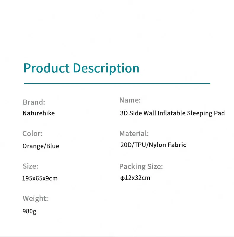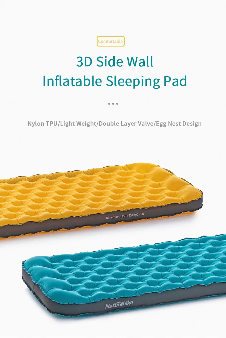 Бренд: Naturehike Название: 3D Надувной Спальный коврик с боковой стенкой Материал: нейлон 20D/ТПУ Вес: 980 г Размер: 195*65*9 см Размер упаковки: φ12*32 см Цвет: синий/желтый Аксессуары: сумка для хранения/надувная подушка/лента для крепления/Сумка для ремонта Использование: Кемпинг/Туризм/путешествия